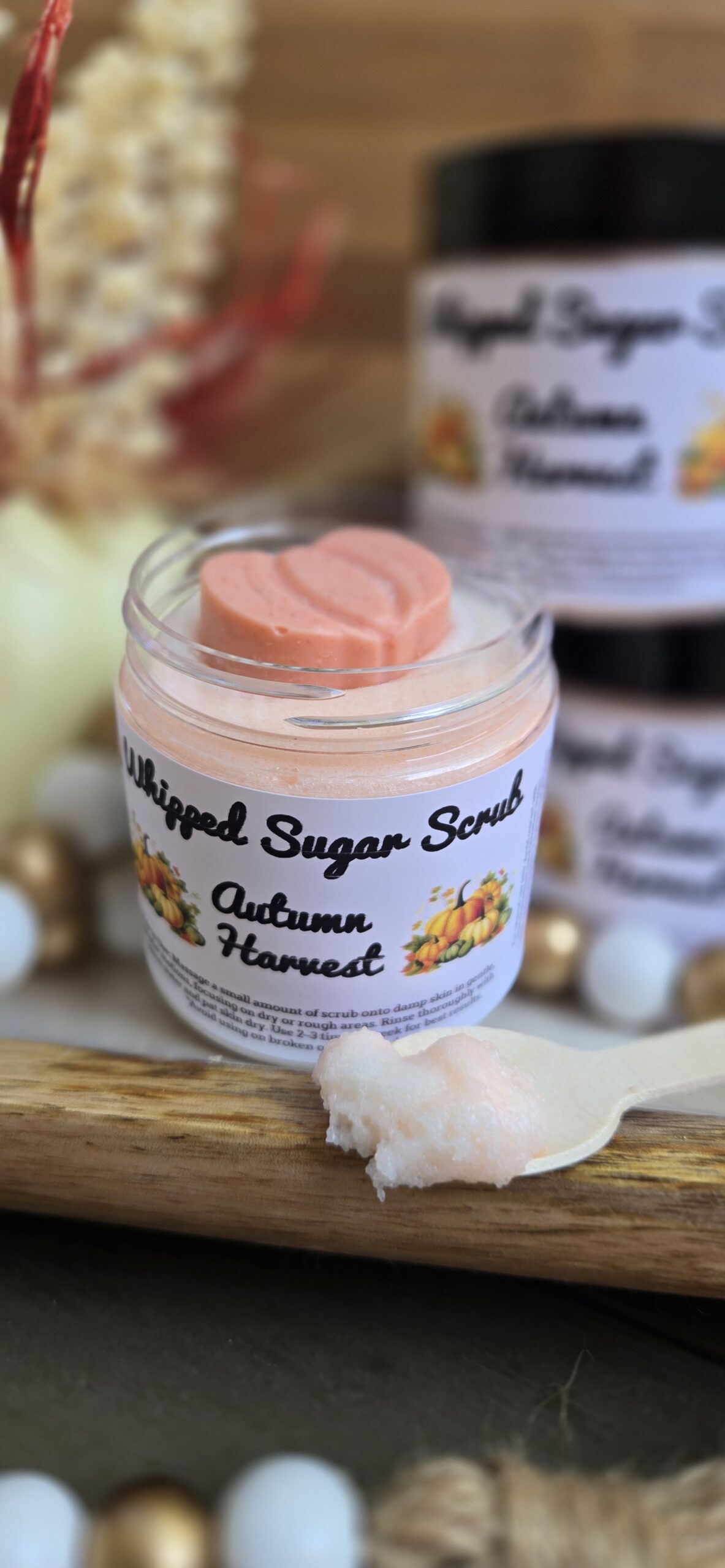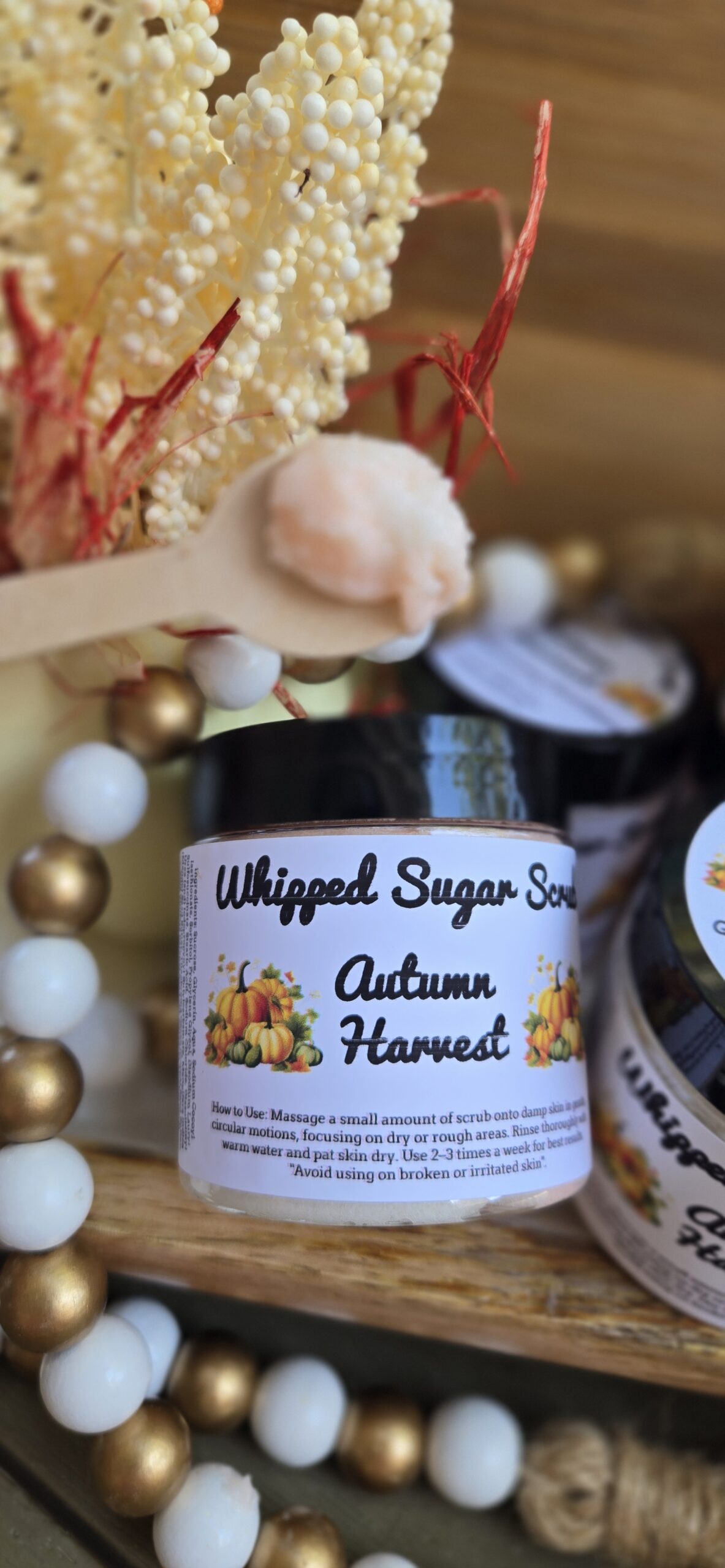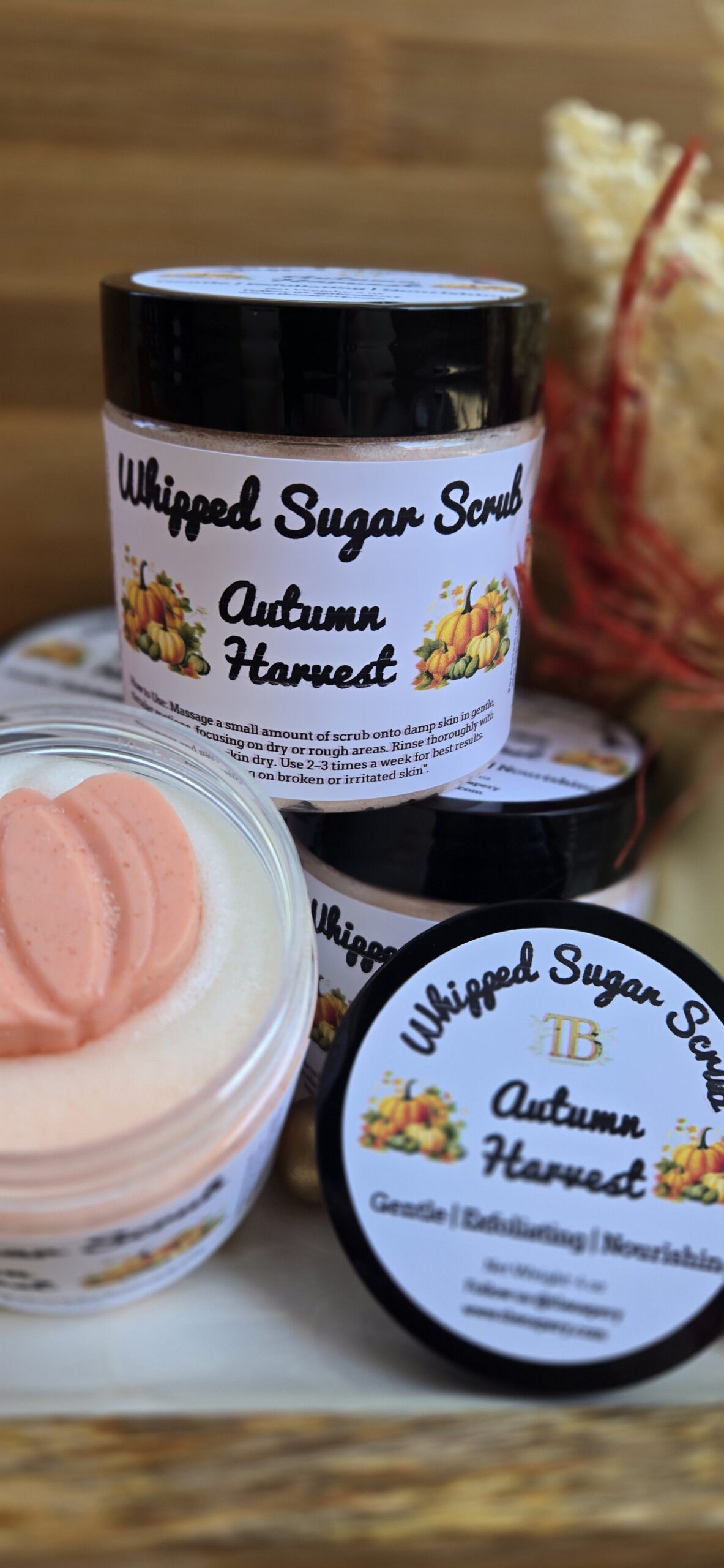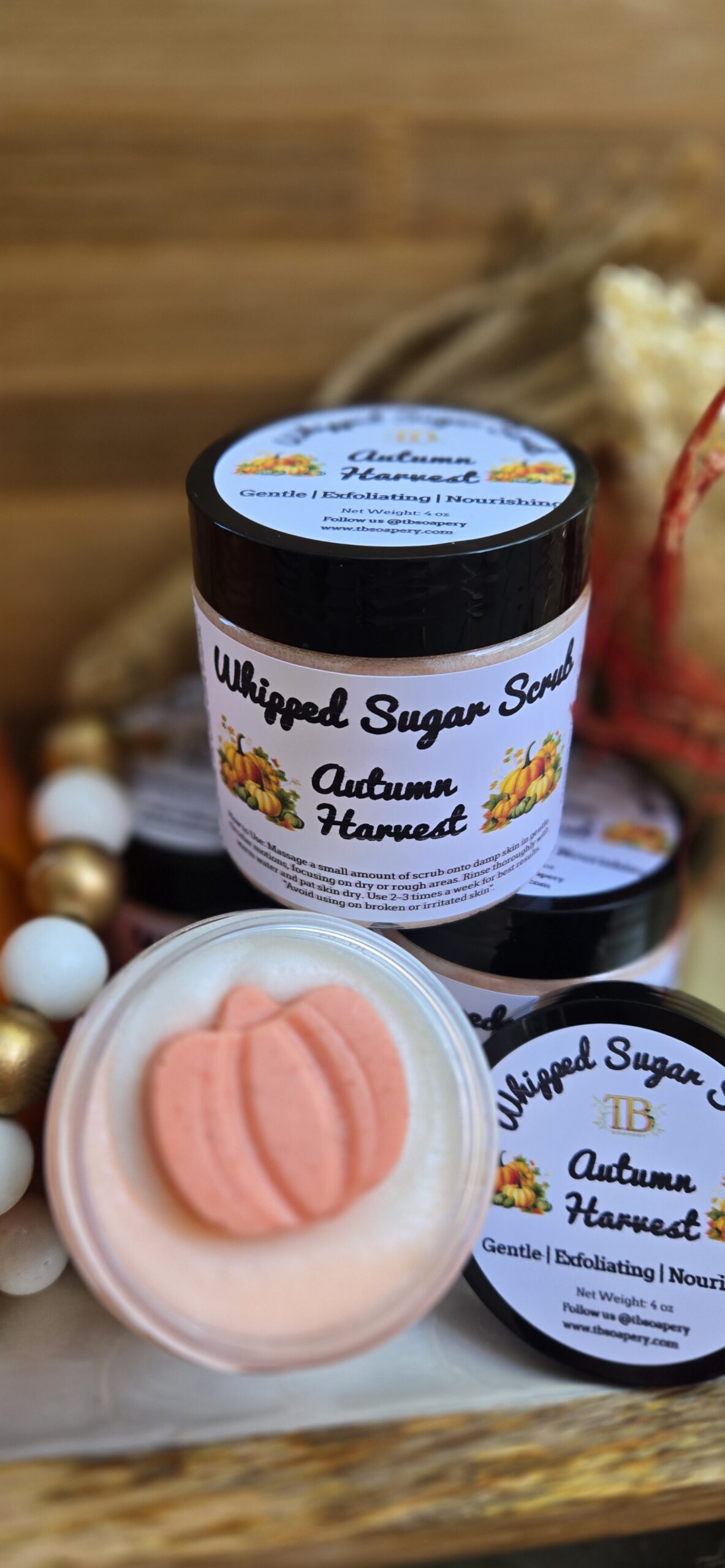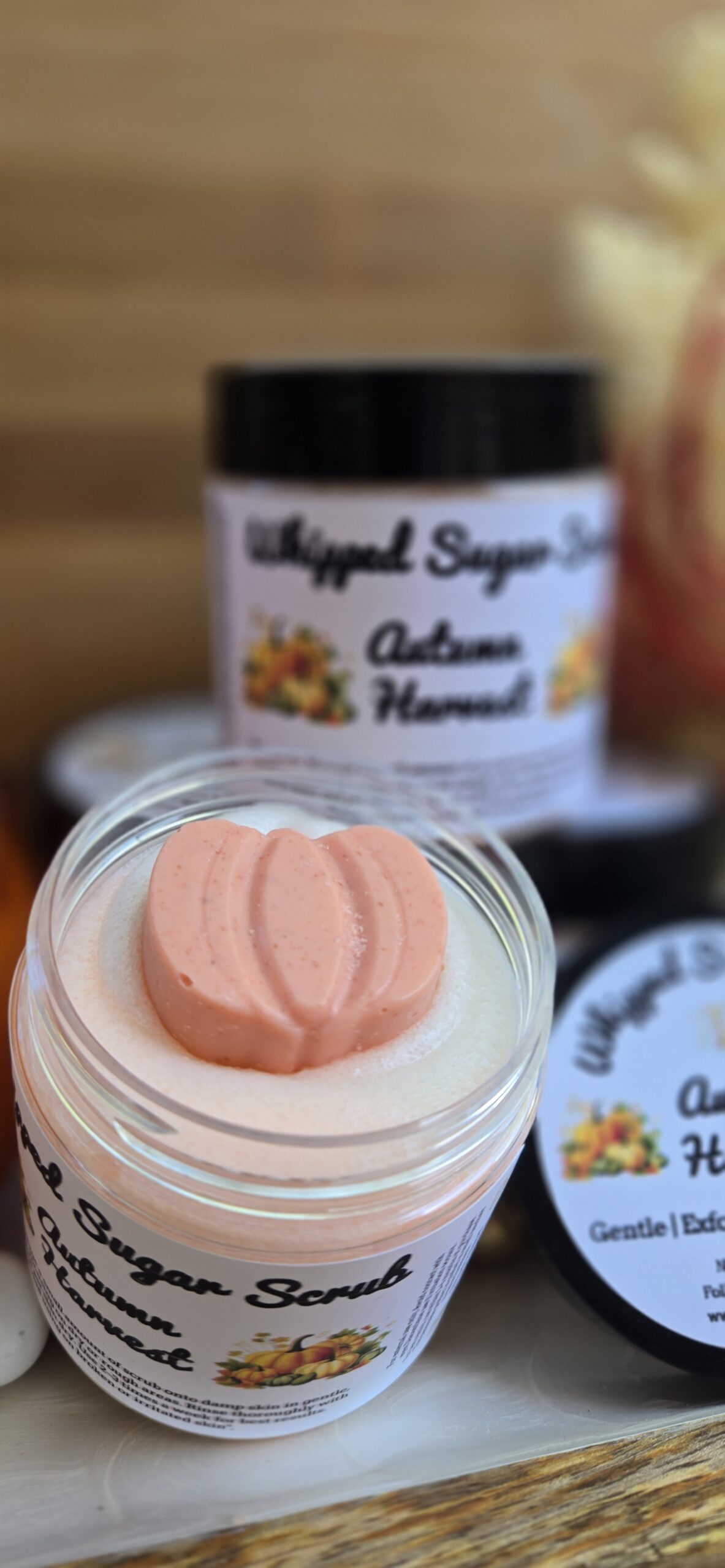 Celebrate the warmth of fall with our Whipped Sugar Scrub โ€“ Autumn Harvest, a decadent blend of gentle exfoliants, nourishing butters, and cozy fragrance. This foaming scrub polishes away dull skin while wrapping you in the irresistible scent of pumpkin pecan waffles and vanilla pumpkin marshmallow.