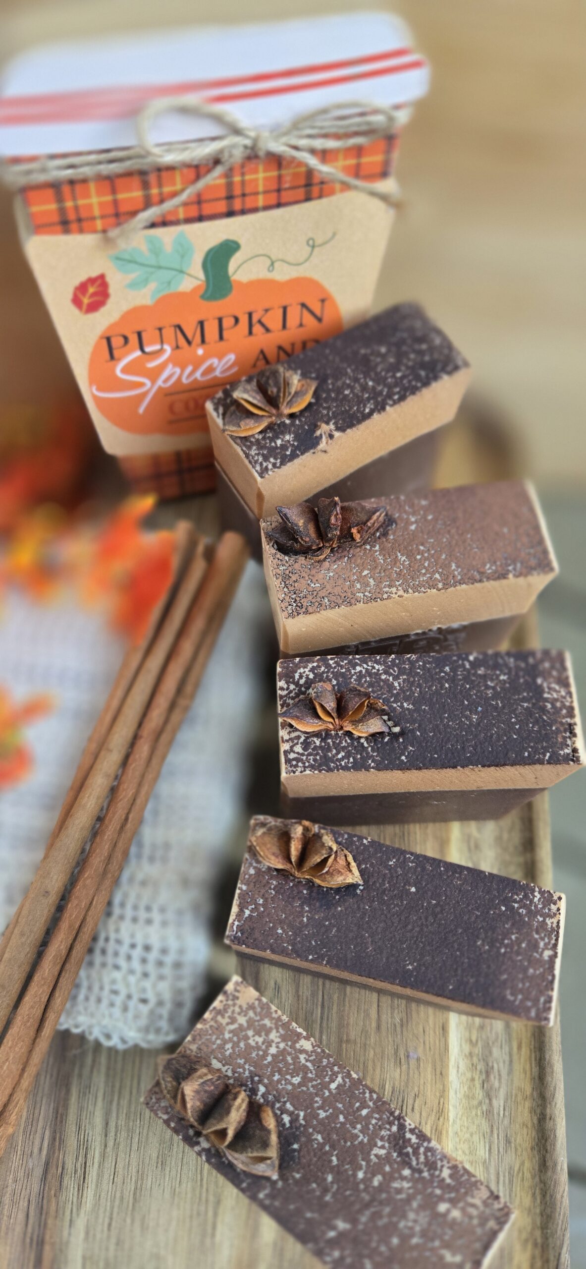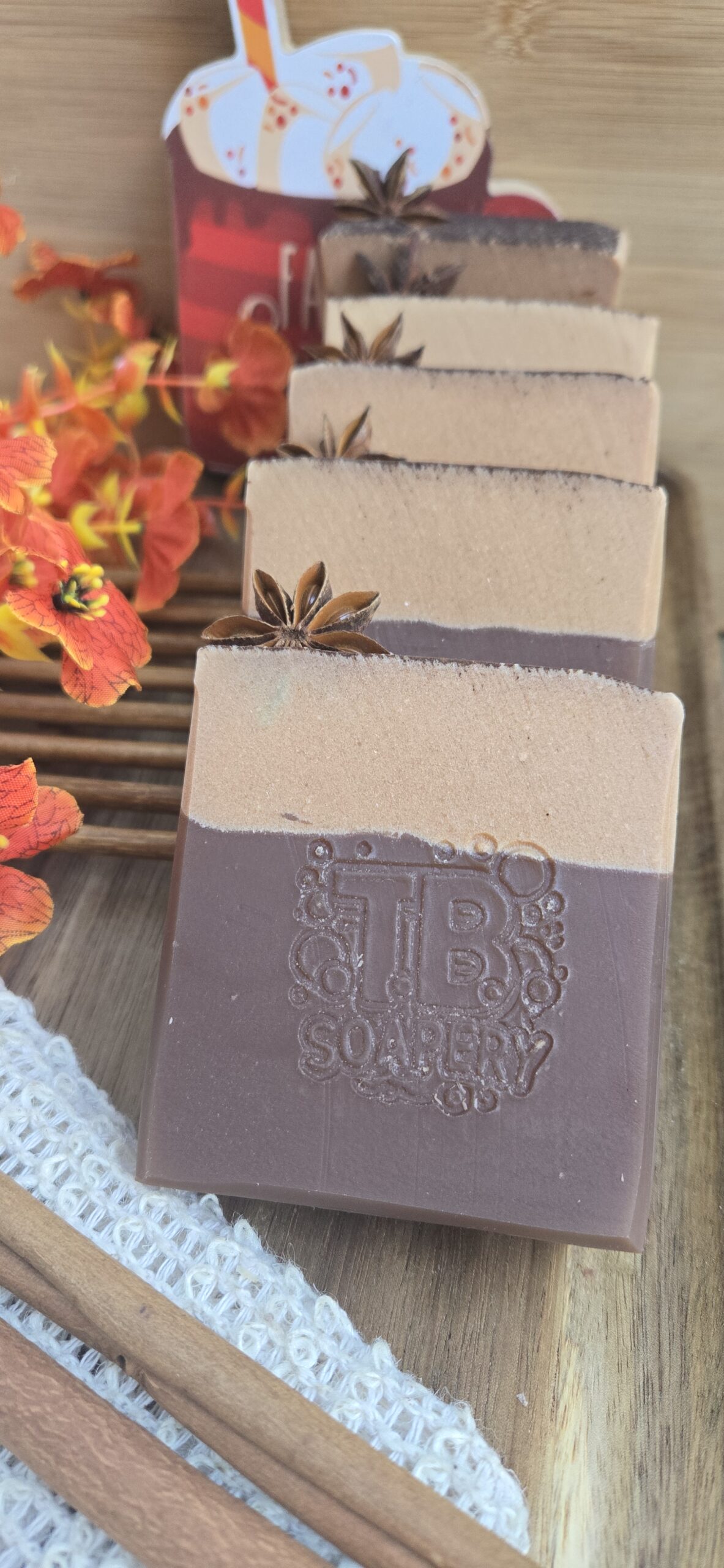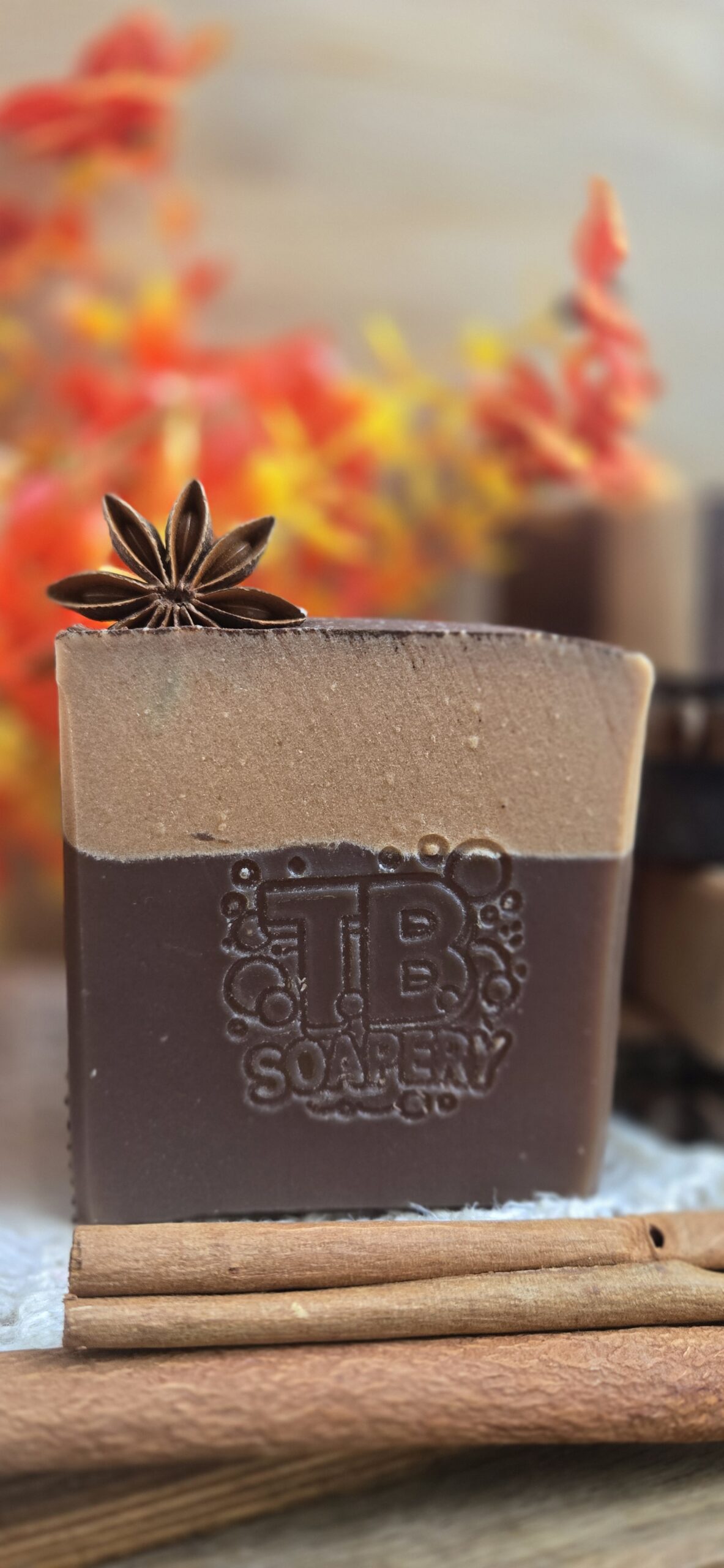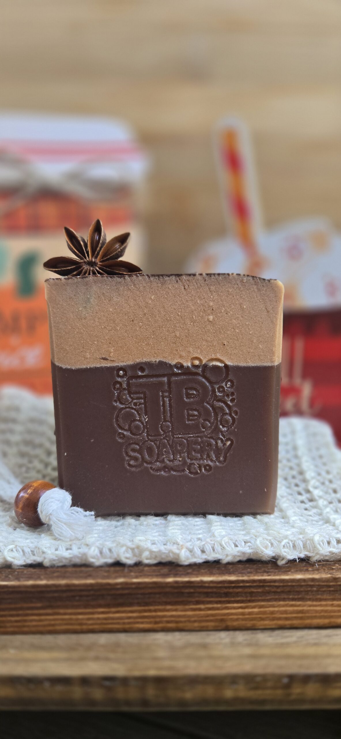 Ingredients: Beef Tallow, Lard, Coconut Oil, Olive Oil, Castor Oil, Lye, Water, Greek Yogurt, Aloe Vera Juice, Kaolin Clay, Titanium Dioxide, Cocoa Powder, and Fragrance. Decorated with a star anise, adding a natural and comforting element.