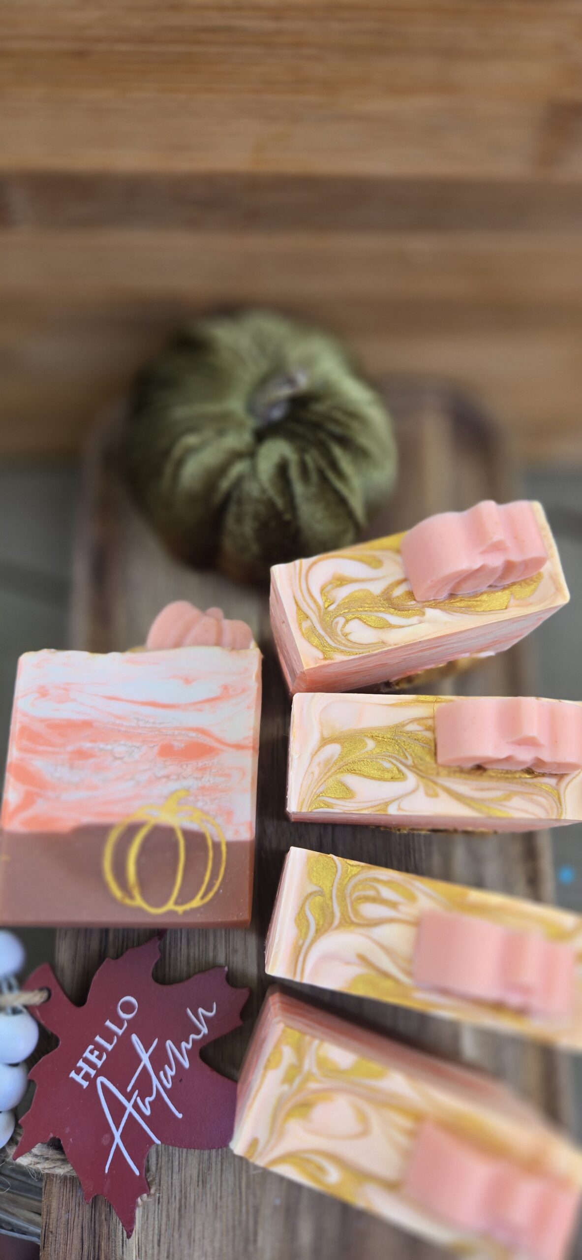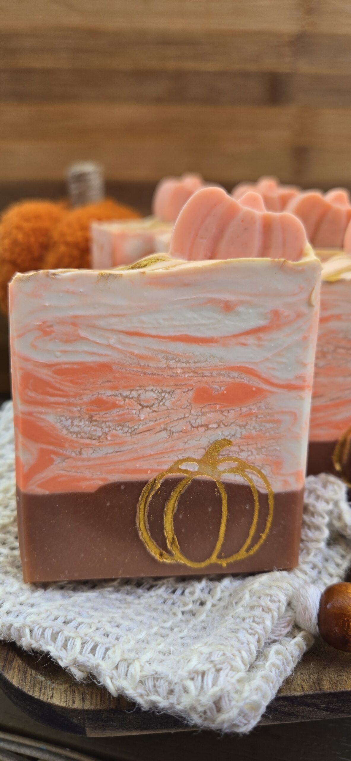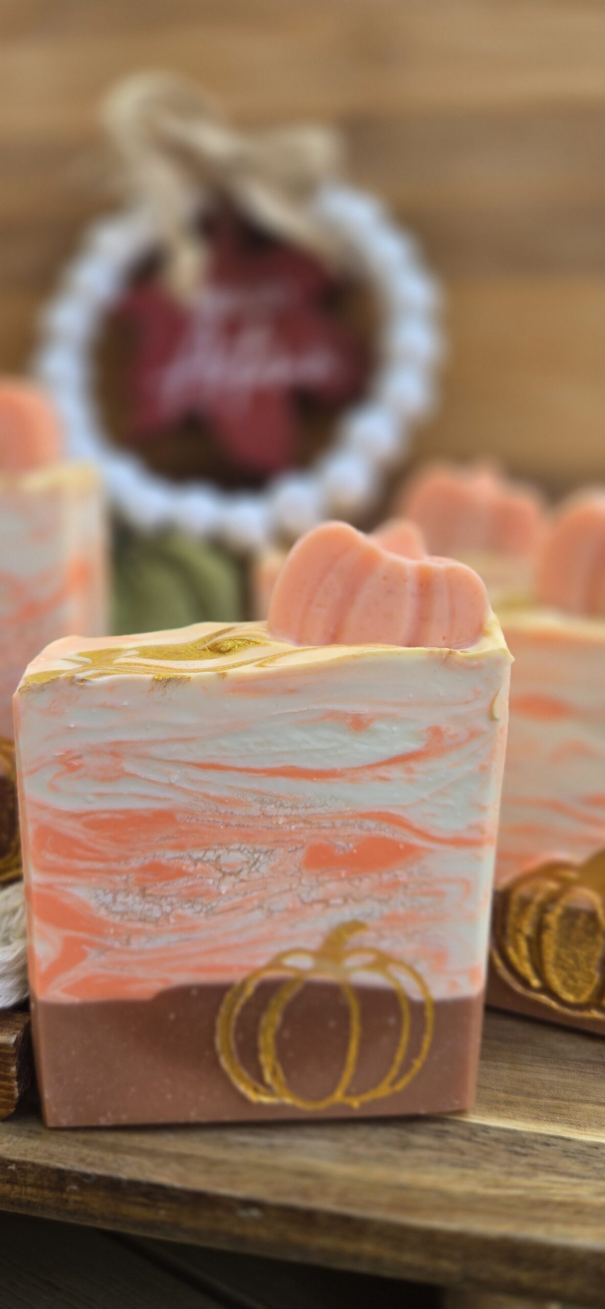 Ingredients: Beef Tallow, Coconut Oil, Sunflower High Oleic, Oil, Mango Butter, Castor Oil, Lye, Water, Aloe Vera Juice, Sugar, Buttermilk, Mica Biodegradable, Titanium Dioxide, and Fragrance. Top embeds (Pumpkins) made with melt & pour soap base, vegetable glycerin and biodegradable mica.