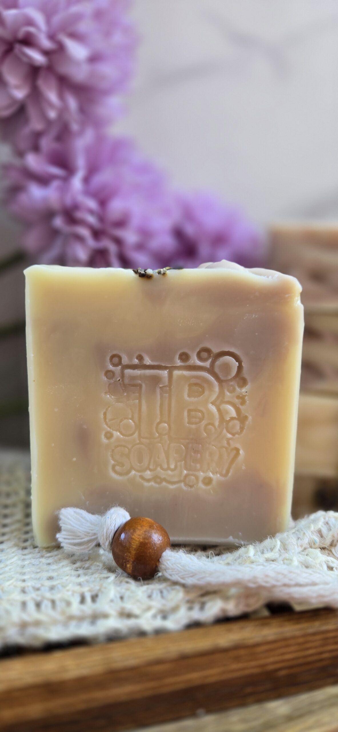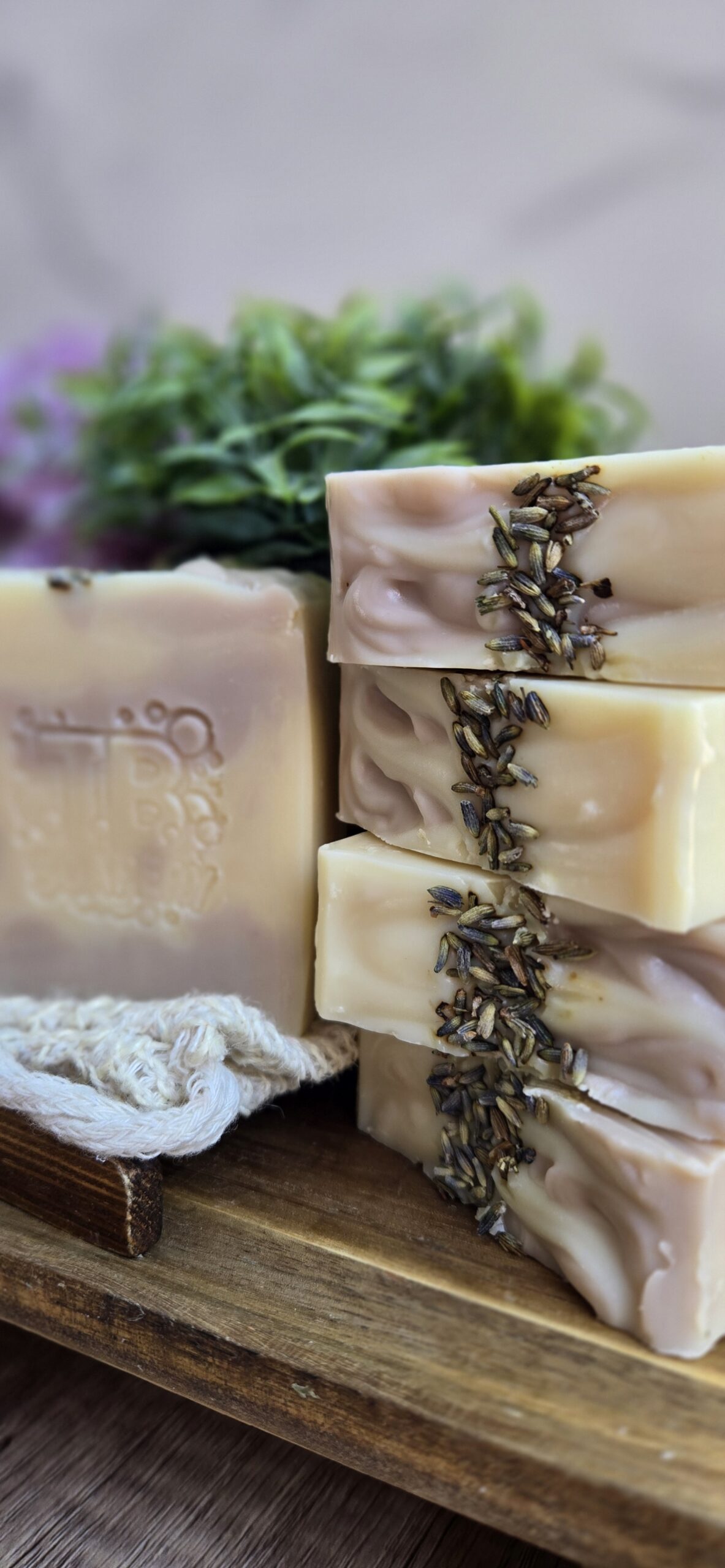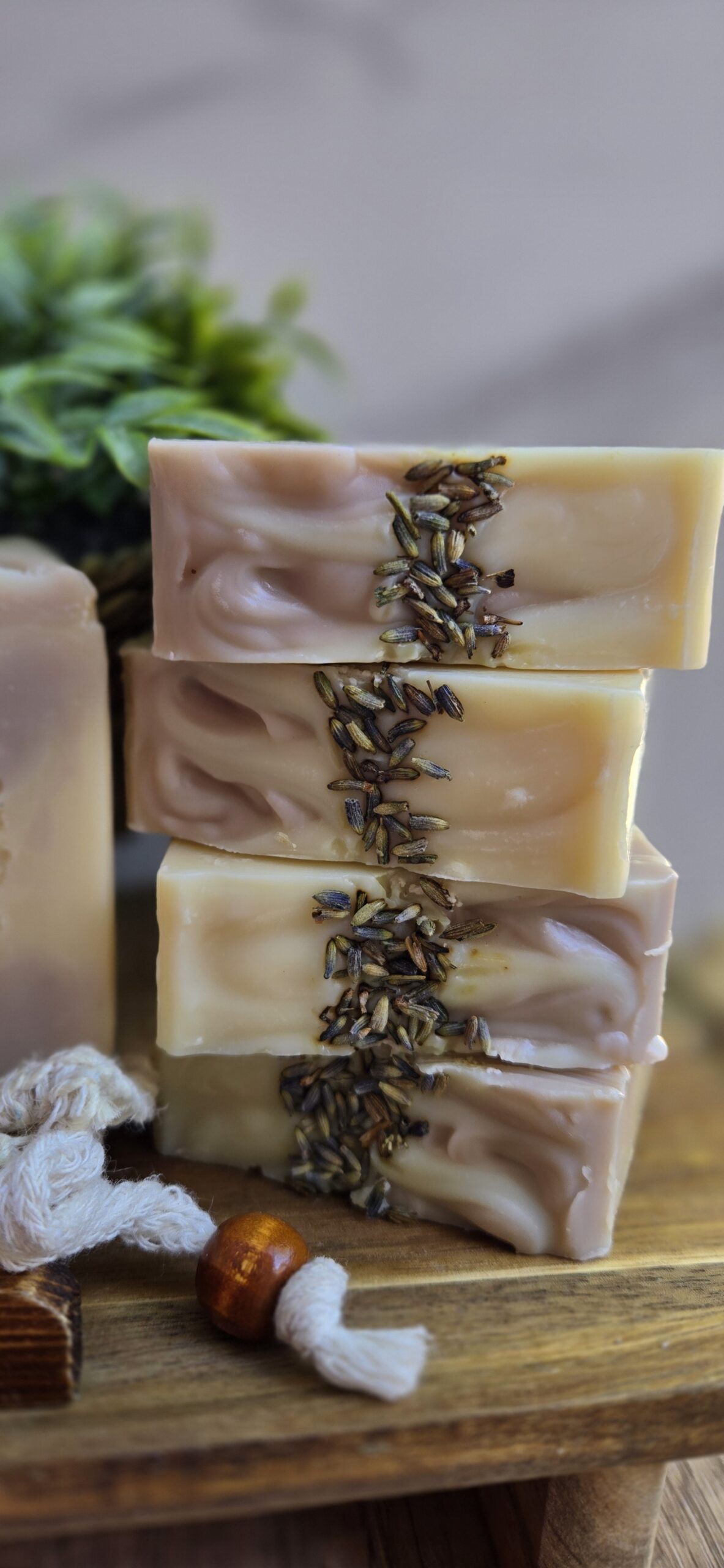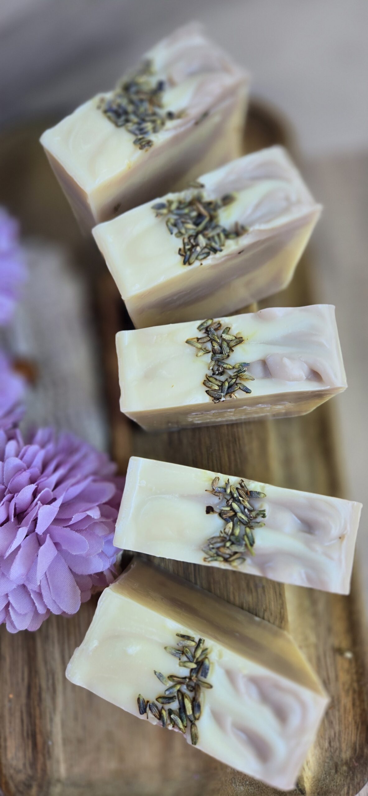 Ingredients: Olive Oil, Coconut Oil, Mango Butter, Avocado Oil, Castor oil, Shea butter, Lye, Water, Aloe Vera Juice, Goat Milk, Purple Brazilian Clay, Lavender 40/42 Essential Oil, Lavandin Grosso Essential Oil, and Lavender buds on top.
