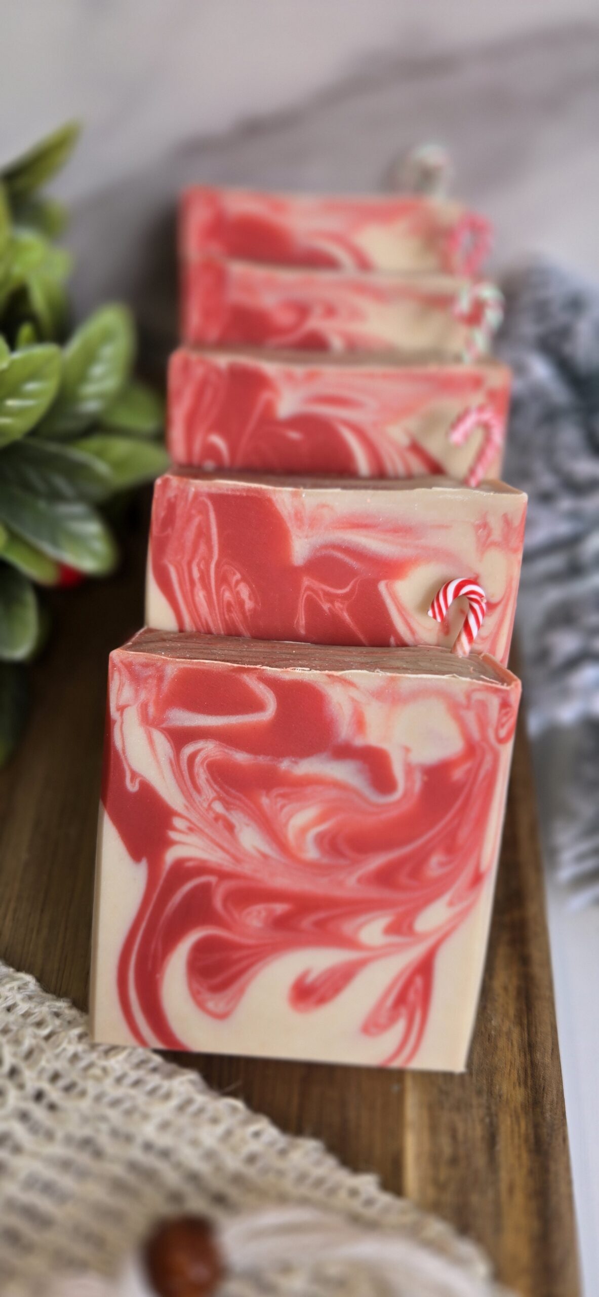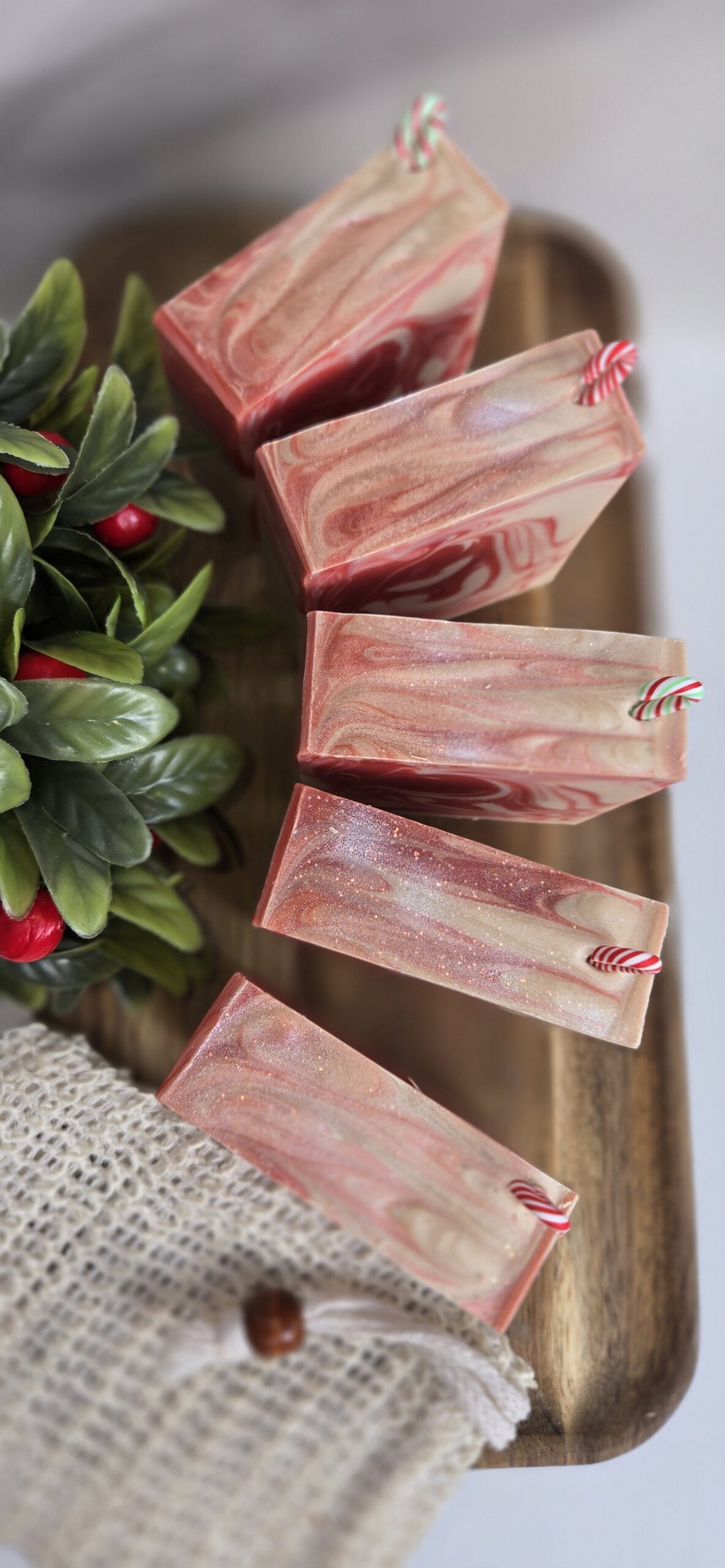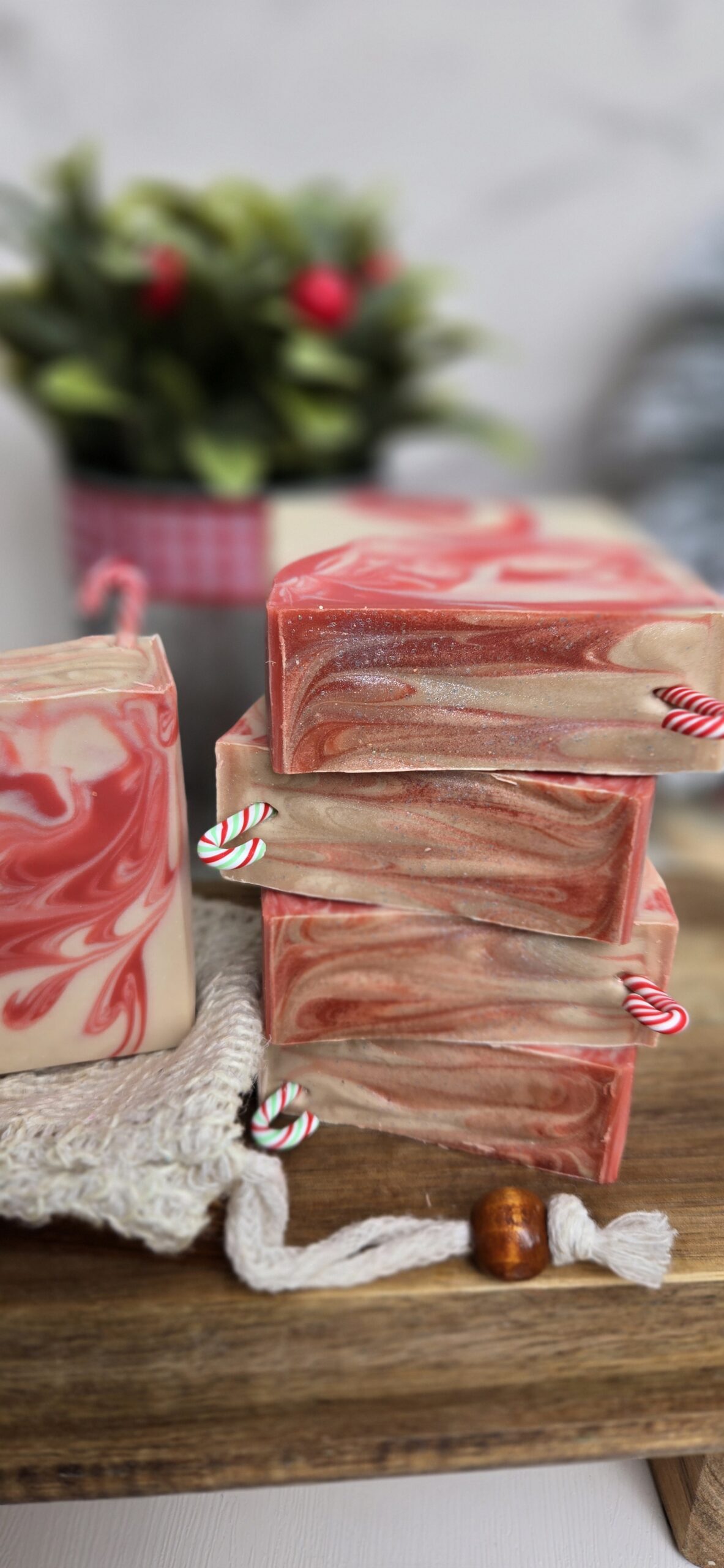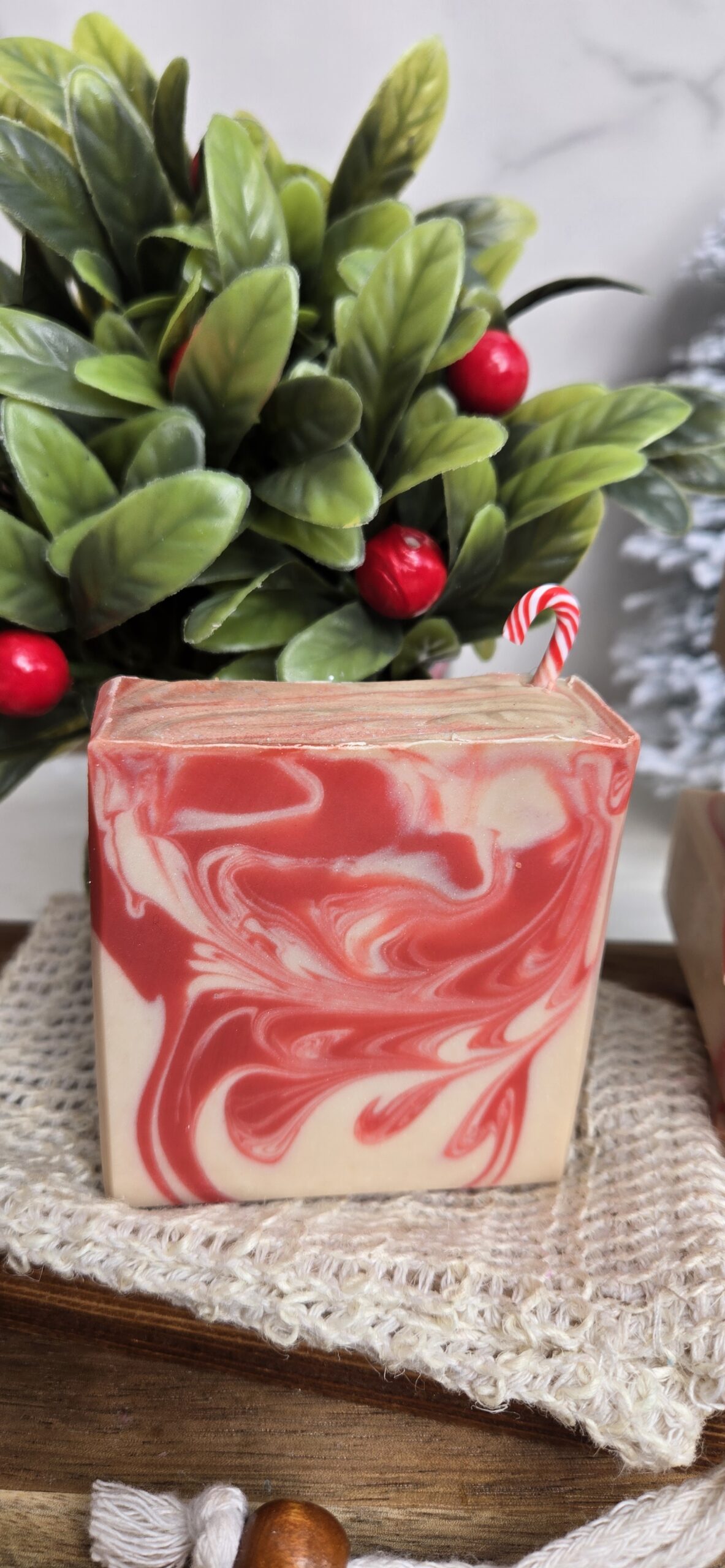Ingredients: Saponified oils of Beef Tallow, Lard, Coconut, Olive, and Castor; Goat Milk; Buttermilk; Colloidal Oatmeal; Kaolin Clay; Skin-safe colorant; Peppermint Essential Oil, Mini Candy Cane Artificial Decoration on top, and Fragrance.